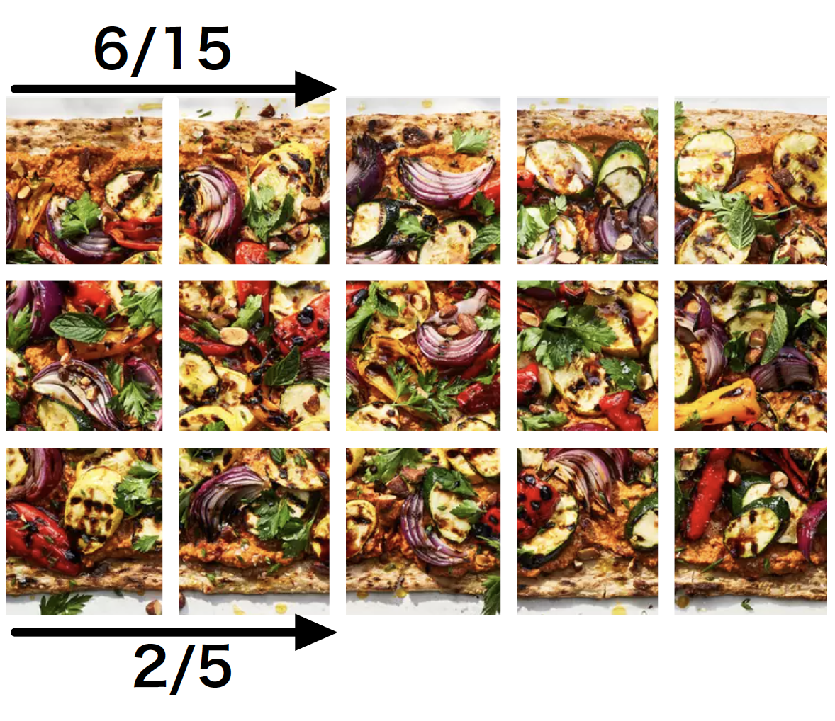 To see why, consider what happens when I cut the flatbread the other direction twice. Now the entire flatbread has 15 squares. Hayfa ate 2 slices out of the original 5 slices total. Or, equivalently, she ate 6 squares out of 15 original squares. You may have heard of reducing or cancelling fractions, which is a way to remember what’s happening here: