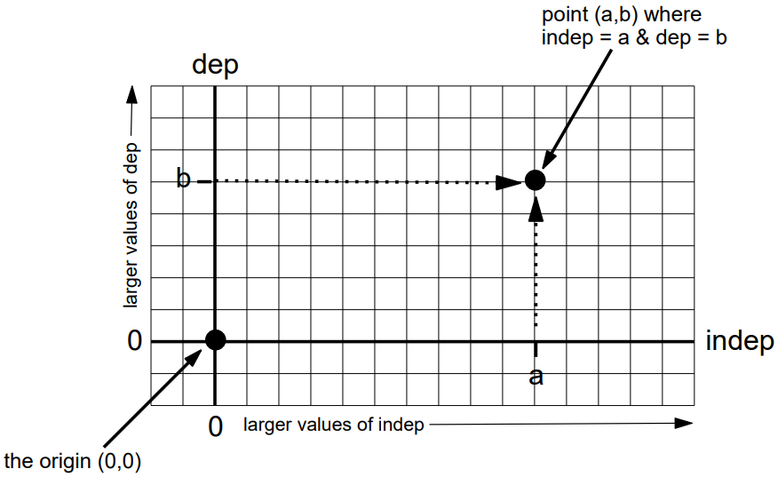 Where they cross is a point called the origin. It represents where each variable is 0. By convention, the independent variable is measured along the horizontal axis, with larger values progressing to the right of the origin, and negatives to the left. Similarly, the dependent variable is measured along the vertical axis, with larger values progressing up from the origin, and negatives down. Each pair of values of the independent and dependent variable from our table corresponds to a point on our graph.