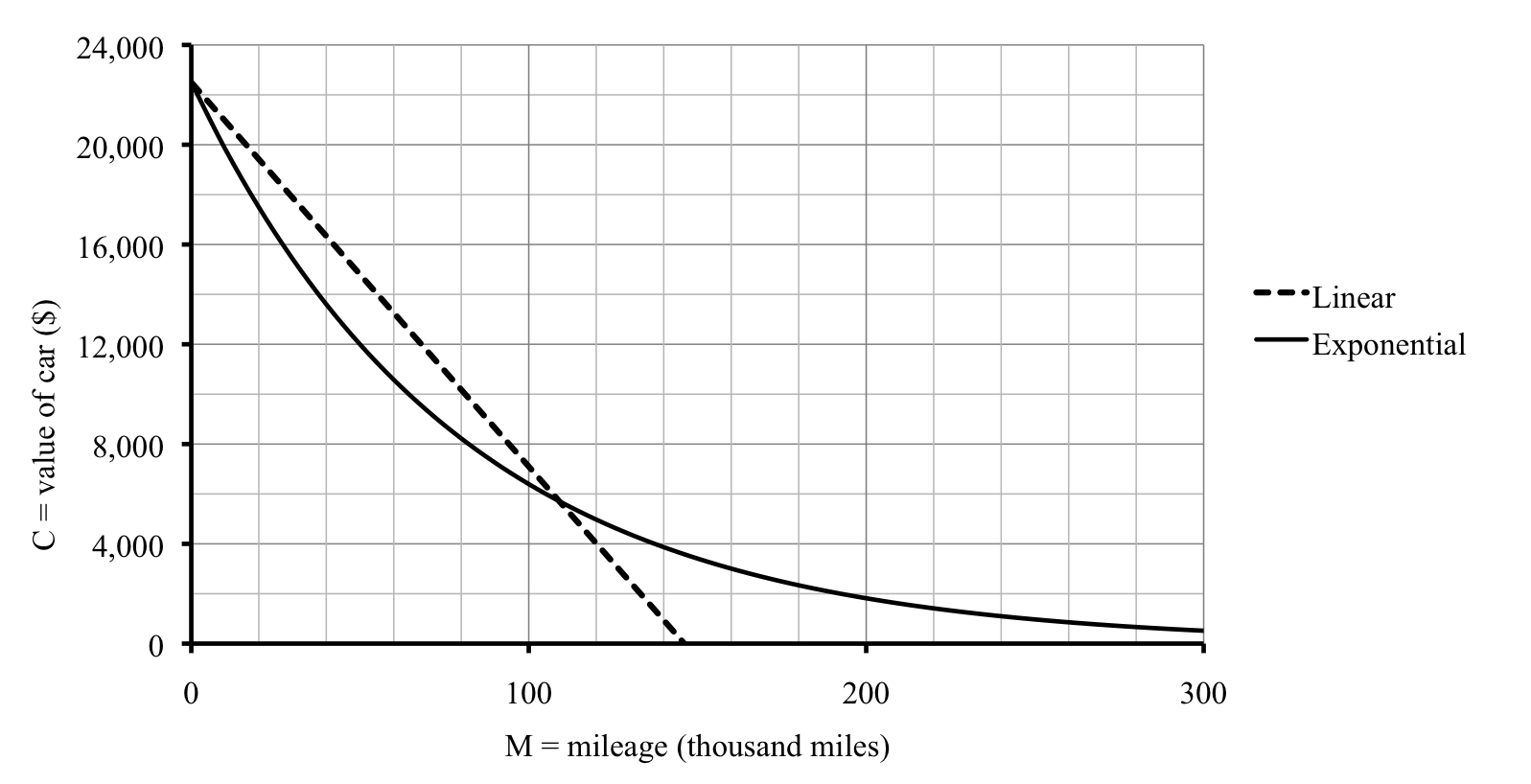 Wait a minute. Does a car lose the same value for each thousand miles itβs driven? Thatβs what it means to be linear. Every thousand miles, same decrease. Nah, thatβs not right. Once the car is old, another 1,000 miles or so probably wonβt affect the value at all. Also, when a car is new, once you drive it off the lot and then that strange vinyl smell wears off and itβs officially βused,β the car is worth a lot less. Even if it hasnβt been driven much at all. What would each model say the car was worth soon after SofΓa bought it, say with 10,000 miles on it? With \(M=10\text{,}\) the estimates are