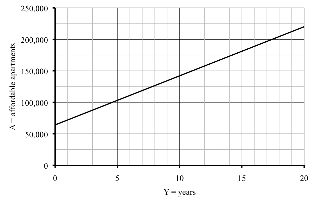 As expected, the graph is a straight line. And we see that the city should reach its goal of 150,000 affordable apartments in 12 years, or slightly before then.