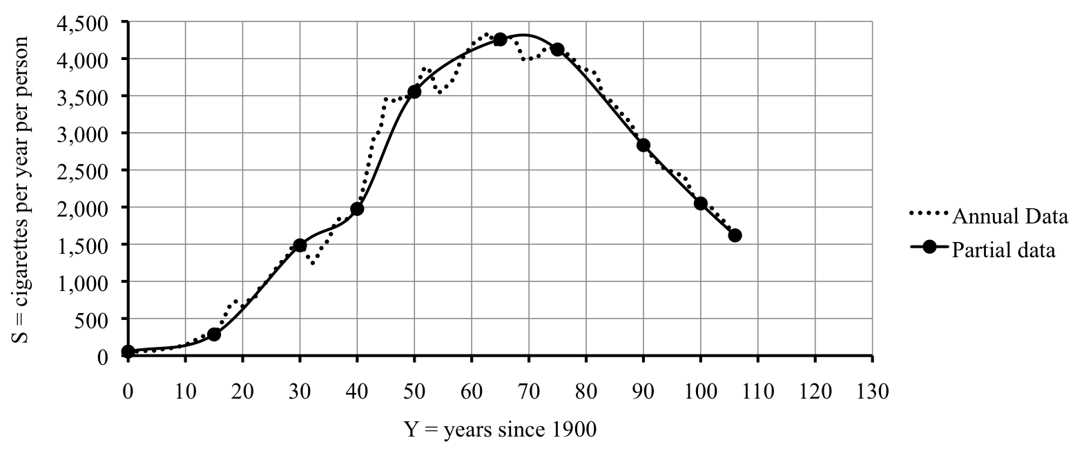 Turns out more data is available from the CDC. The full table of data from the CDC shows that consumption first topped 3,000 as early as 1944. Hereβs an example where the history tells you more than the mathematics as cigarette consumption rose sharply during World War II. Our guess about 1988 or 1989 was spot on. Look at how the graph from the full data (the dotted line) compares to our guess.