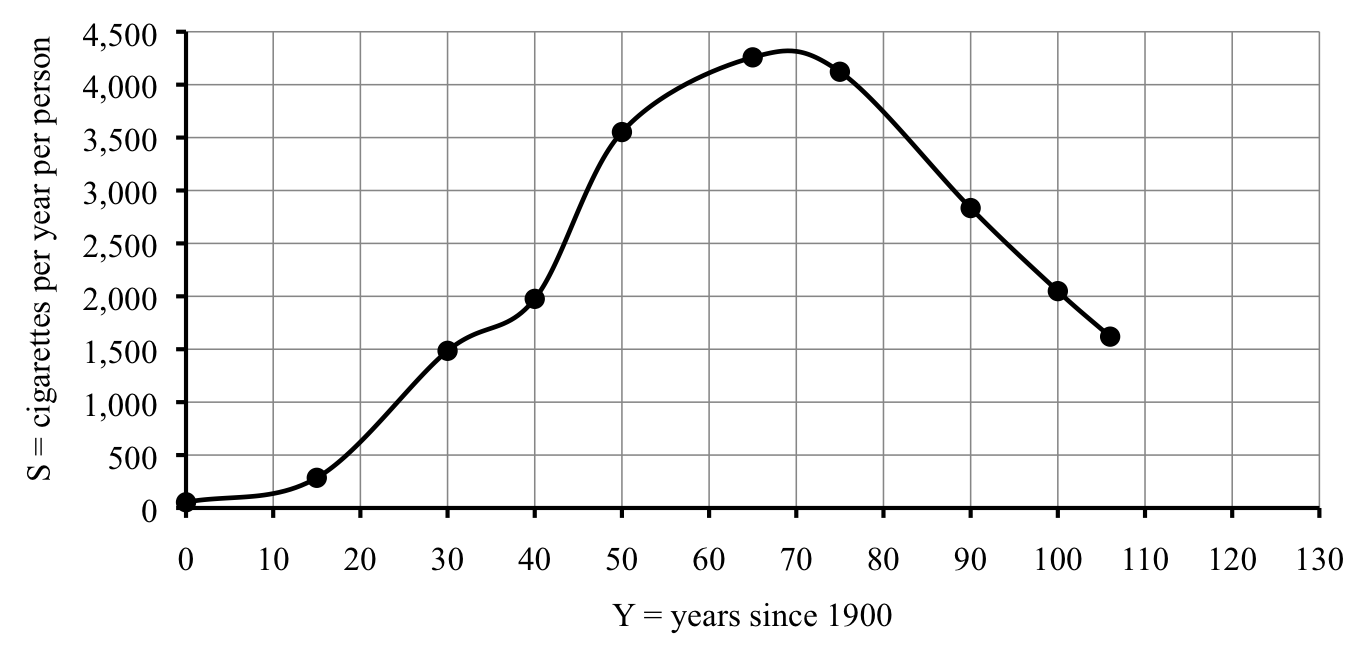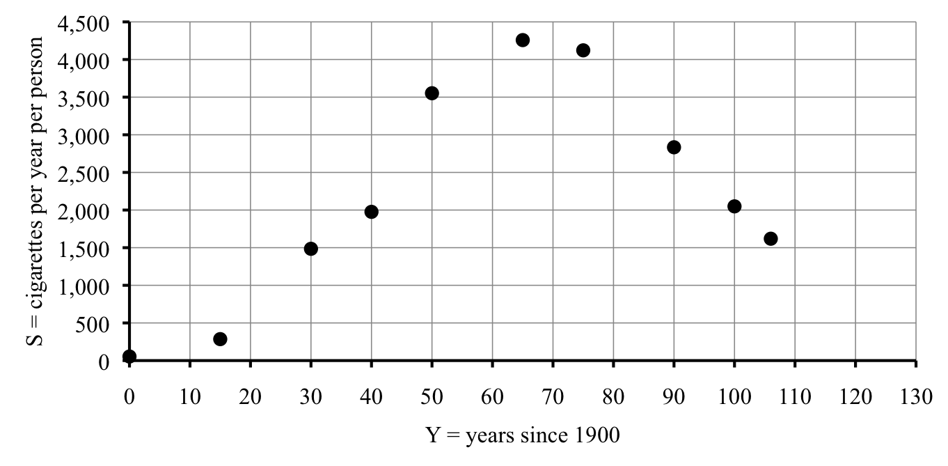 To plot each point, we start at the origin and move right to that \(Y\)-value, and then up to that \(S\)-value. When a value doesnβt land exactly on a grid mark, we have to guess in between. For example, in 1900, \(Y=0\) so we donβt move right at all, just up to \(S=54\text{.}\) The first labeled gridline on our graph is 500. Whereβs 54? Itβs between 0 and 500, very close to 0. Our point is just a tiny bit above the origin. In 1915 we have \(Y=15\text{.}\) Our labeled gridlines are for 10 and 20, so 15 must land halfway in between. The smoking rate is 285, which is around halfway between 0 and 500. Etc.